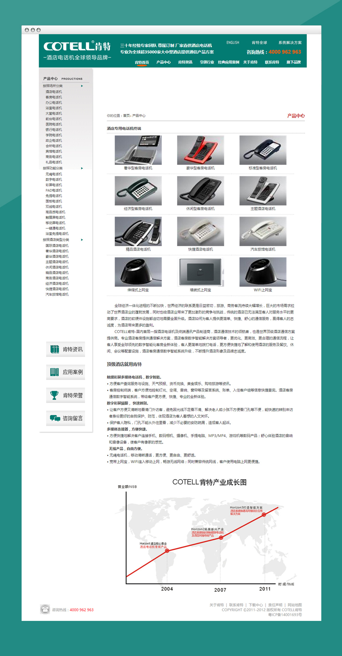 酒店电话机全球领导品牌——COTELL肯特成立于2004年,注册资金一千万,是集研发、生产和销售为一体的“国家级高新技术企业”,并获得了“国家双软企业认证”,引领全球酒店数字技术的创新与发展,为世界顶级酒店提供数字智能化整体解决方案。